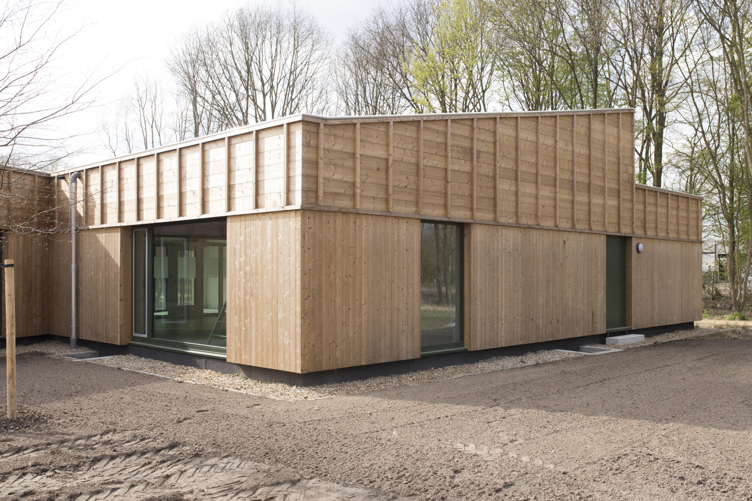 De volledige K-dienst is gerealiseerd in houtmassiefbouw. Niet alleen een milieubewuste keuze, maar ook goed passend bij het beoogde beeld van een dorpje in het groen. En dit zowel binnen als buiten.